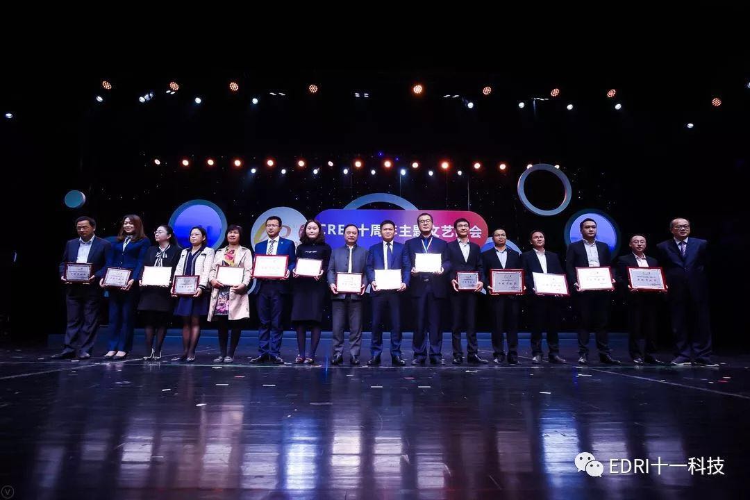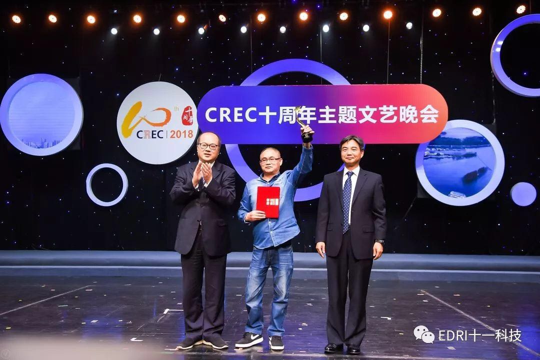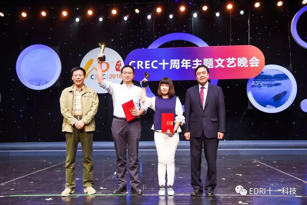十一科技榮獲CREC十周年“卓越貢獻(xiàn)獎”企業(yè),趙振元同志榮獲CREC十周年“卓越貢獻(xiàn)獎”個人,余才志同志代表十一科技上臺領(lǐng)獎。